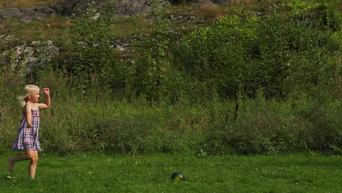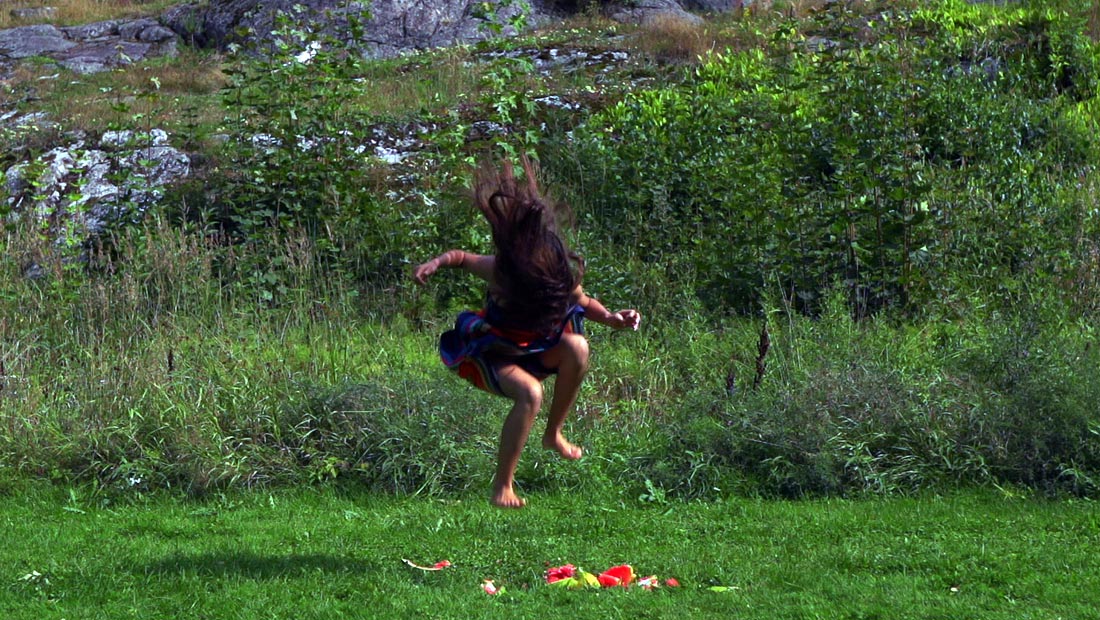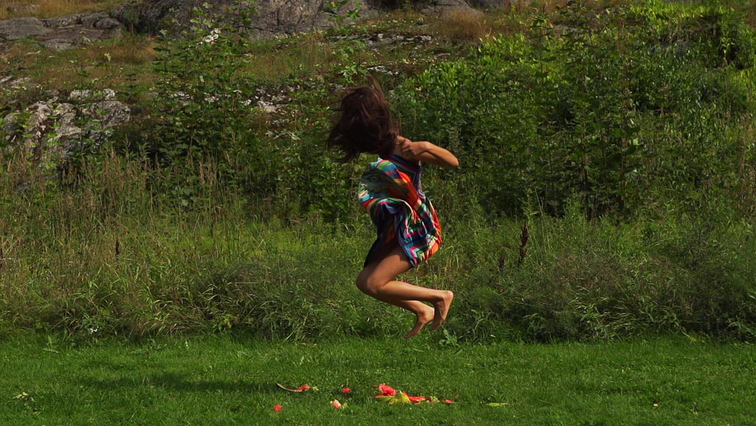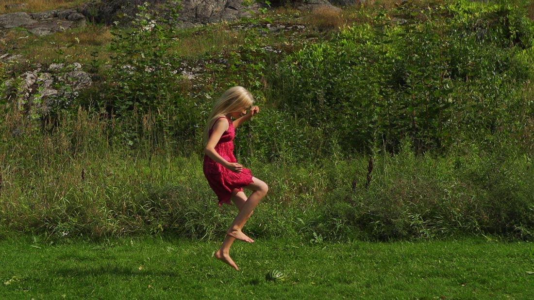 Girls Just Wanna Have Fun is a video installation on three channels. It shows a panorama of a landscape with three young girls of different age jumping across a meadow. Each on their turn they jump across the landscape. In the image on the middle they stop and start crossing watermelons. A rhythmic soundscape accompany the girls. The piece is a loop; each girl crosses the frame twice. In the end they run across the screen hand in hand.