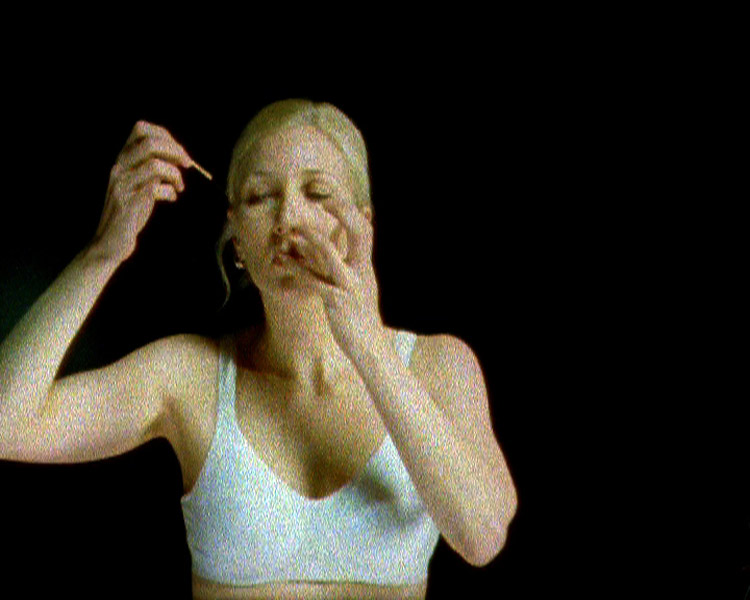 Series of videos where the same woman performs absurd things, such as hits herself and tries to close her mouth by sawing it. The work was originally made to relate to works in the collection of Oulu Art Museum, Finland, to the exhibition Human traces, curated by Juha-Heikki Tihinen.