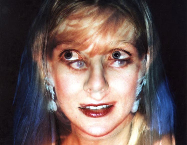 A projection of princess Diana's face on the artist's face. Subtitles are instructing how to fit in to the image of the princess.